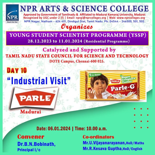 The NPR Arts & Science College organizes an Industrial Visit to Parle Biscuit Factory, Madurai, Day – 10 of the Young Student Scientist Programme (YSSP) – 2023