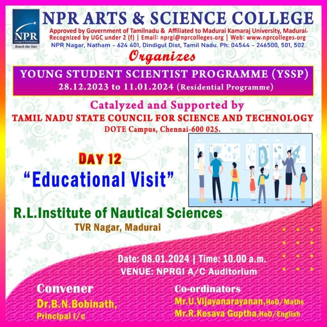 The NPR Arts & Science College organizes an Educational Visit to R.L. Institute of Nautical Sciences, Madurai, Day – 12 of the Young Student Scientist Programme (YSSP) – 2023