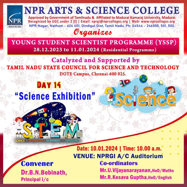 The NPR Arts & Science College organizes a Science Exhibition, Day – 14 of the Young Student Scientist Programme (YSSP) – 2023