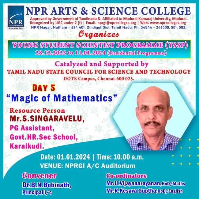 The NPR Arts & Science College organizes a Guest Lecture on the Magic of Mathematics, Day – 5 of the Young Student Scientist Programme (YSSP) – 2023