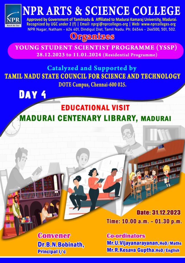 The NPR Arts & Science College organizes an Educational Visit to Madurai Centenary Library, Day – 4 of the Young Student Scientist Programme (YSSP) – 2023
