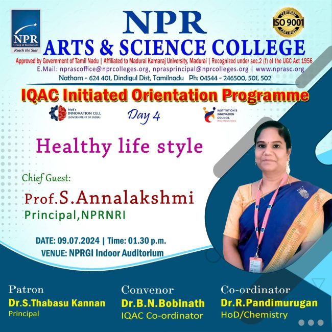 The NPR Arts and Science College organizes a Day – 4 Orientation Program for freshers batch 2024-27 a Guest Lecture on the Healthy lifestyle for their students. Resource Person: Prof. S. Annalakshmi, Principal, NPR College of Nursing and Research Institute – Allied Health Science.