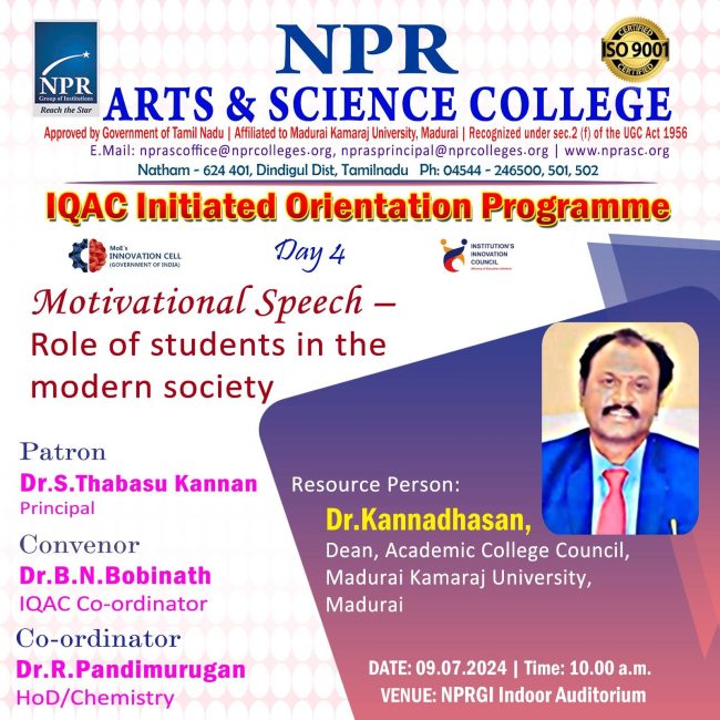 The NPR Arts and Science College organizes a Day – 4 Orientation Program for freshers batch 2024-27 a Motivational Speech on the Role of students in the Modern Society for their students. Resource Person: Dr. Kannadhasan, Dean, Academic College Council, Madurai Kamaraj University, Madurai.