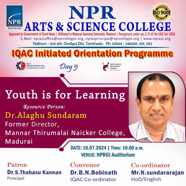 The NPR Arts and Science College organizes a Day – 5 Orientation Program for freshers batch 2024-27 a Guest Lecture on Youth is for Learning for their students. Resource Person: Dr. K. Alagu Sundaram, Former Principal, Mannar Thirumalai Naicker College, Madurai.