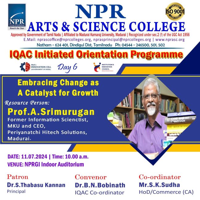 The NPR Arts and Science College organizes a Day – 6 Orientation Program for freshers batch 2024-27 a Guest Lecture on Embracing Change as a Catalyst for Growth for their students. Resource Person: Prof. A. Srimurugan, Former Information Scientist, MKU and CEO, Periyanatchi Hitech Solutions, Madurai.