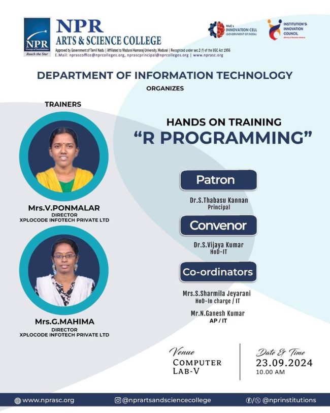 The Department of Information Technology organizes Hands-on Training on R Programming for their students Trainers: Mrs.V.Ponmalar, Director, Xplocode Infotech Private Ltd., Madurai. Mrs.G.Mahima, Director, Xplocode Infotech Private Ltd., Madurai.