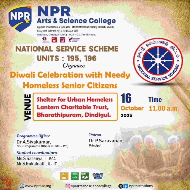 The National Service Scheme Units:195, 196 organizes Diwali Celebration with Needy Homeless Senior Citizens.