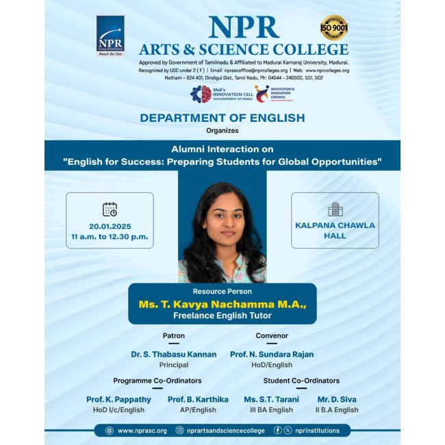 The Department of English Literature organizes an Alumni Interaction on English for Success: Preparing Students for Global Opportunities for their students Distinguished Alumni: Ms. T. Kavya Nachamma, MA., Freelance English Tutor.
