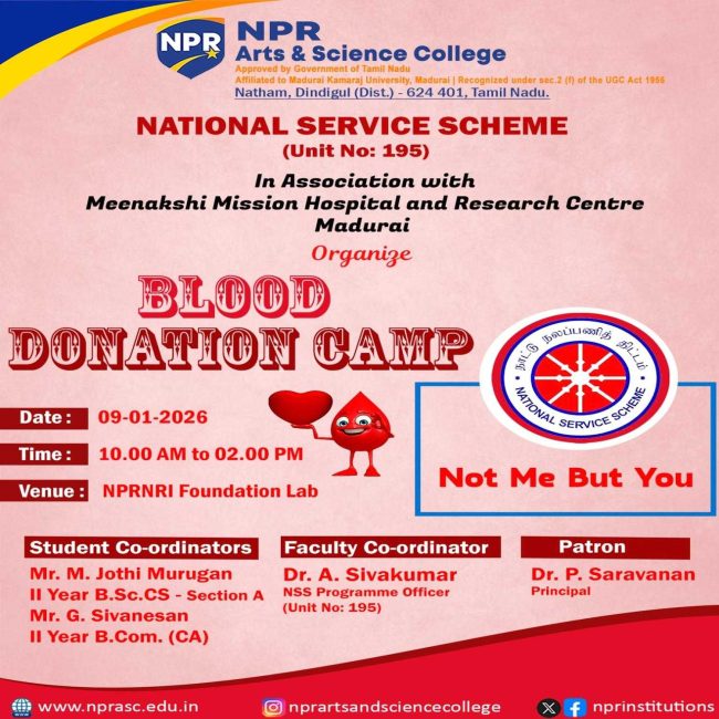 The National Service Scheme Unit (195) organizes a Blood Donation Camp Guest of Honor: Mr. S. Ravi, Senior Manager, Blood Center, Meenakshi Mission Hospital and Research Center, Madurai,.
