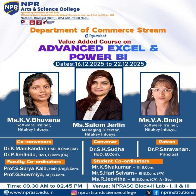The Department of Commerce Stream Organizes the Value Added Course on Advanced Excel & Power BI for their students. Resource Persons: Ms. K. V. Bhuvana Software Trainer, Hitakey Infosys. Ms.Salom Jerlin Managing Director, Hitakey Infosys. Ms. V. A. Booja Software Trainer, Hitakey Infosys.