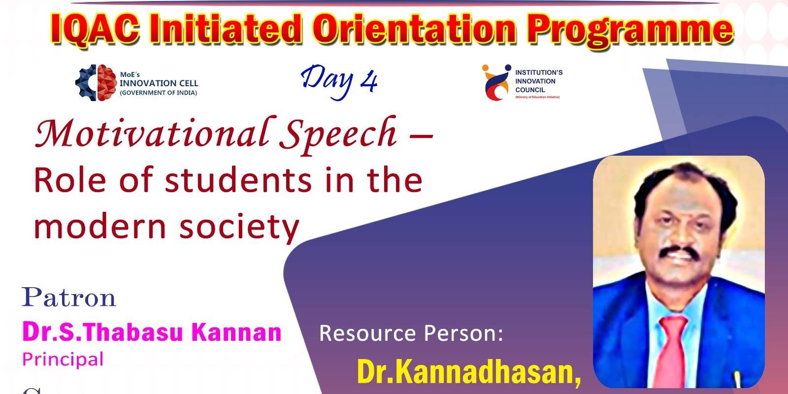 The NPR Arts and Science College organizes a Day – 4 Orientation Program for freshers batch 2024-27 a Motivational Speech on the Role of students in the Modern Society for their students.