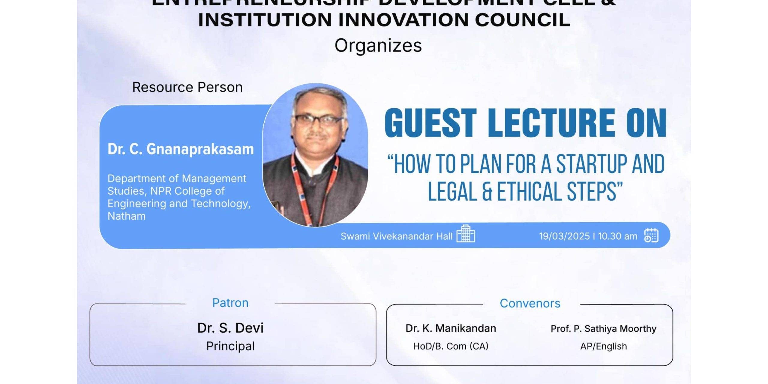 The Entrepreneurship Development Cell & Institution Innovation Council Jointly organizes a Guest Lecture on How to Plan for a Startup and Legal & Ethical Steps for their students