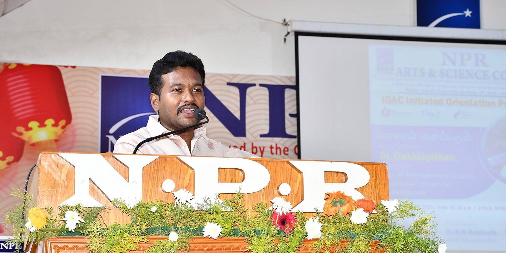 The NPR Arts and Science College organized a Day – 7 Orientation Program for freshers batch 2024-27 a Guest Lecture on Vaanam Vasappadum for their students.