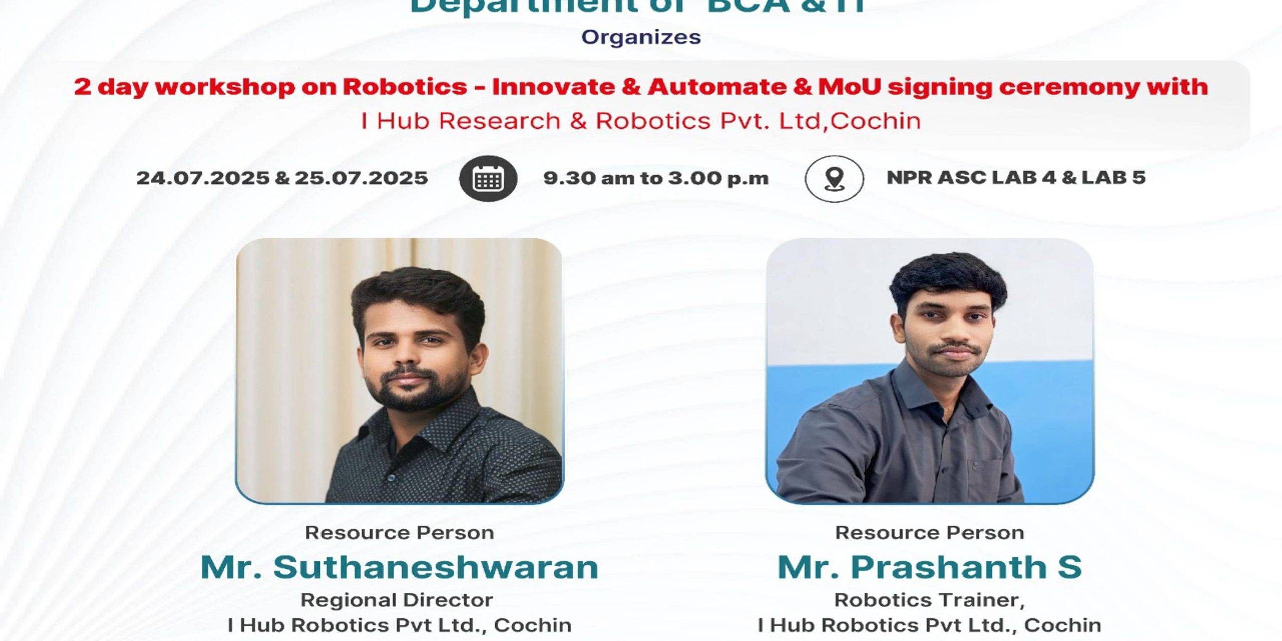 The Departments of Information Technology & Computer Applications are jointly organizes a MoU Signing Ceremony and a 2-Day Workshop on Robotics – Innovate & Automate for their students.