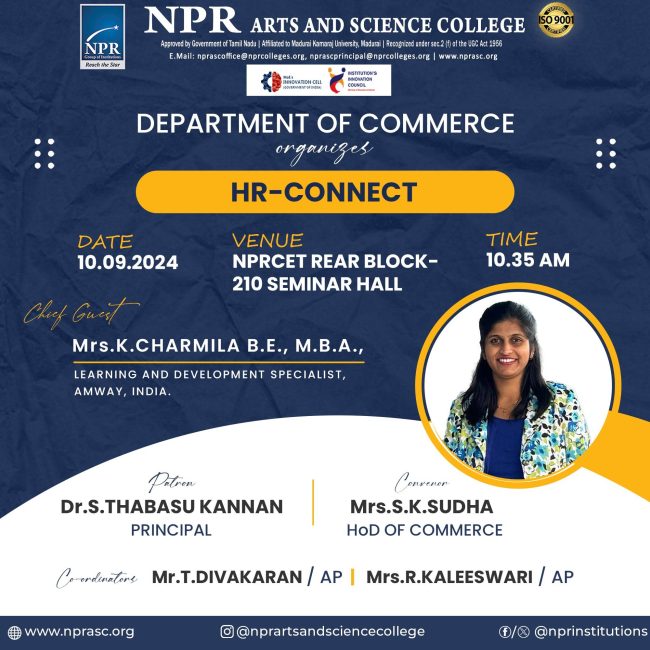 The Department of Commerce organizes HR Connect for their students Chief Guest: Mrs.K.Charmila, B.E., M.B.A., Learning and Development Specialist, AMWAY, India.