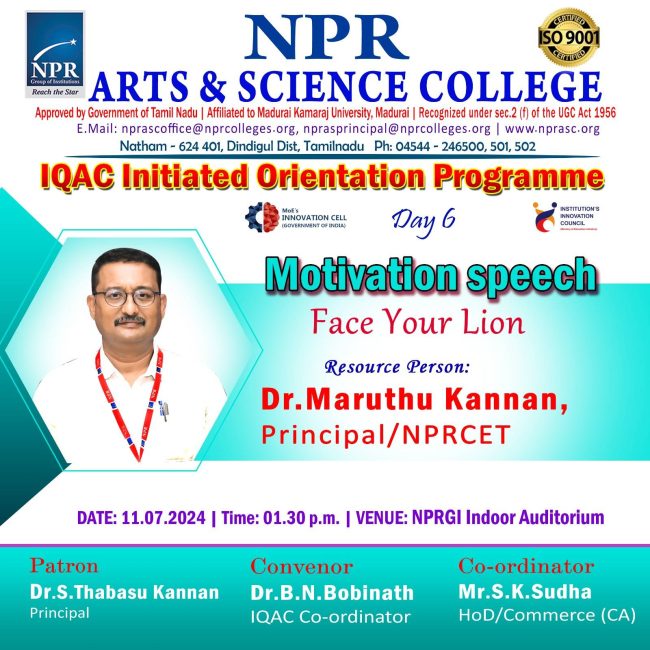 The NPR Arts and Science College organizes a Day – 6 Orientation Program for freshers batch 2024-27 a Motivational Speech for their students. Resource Person: Dr. B. Maruthu Kannan, Principal, NPR College of Engineering and Technology.