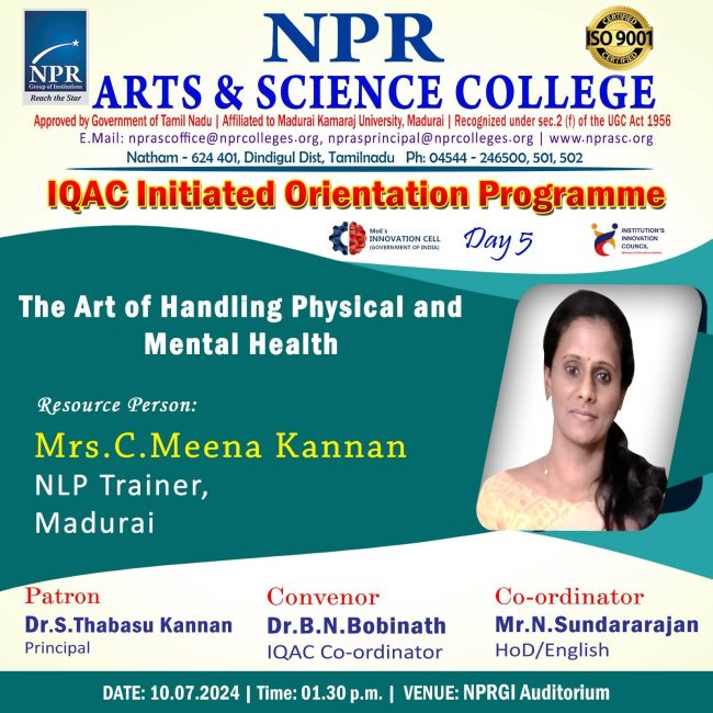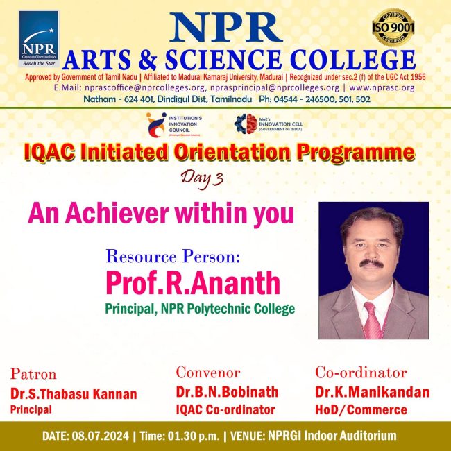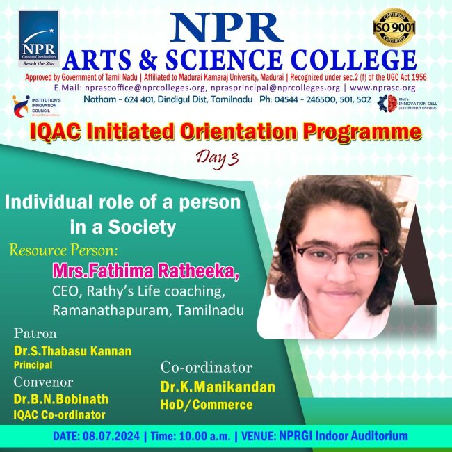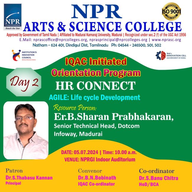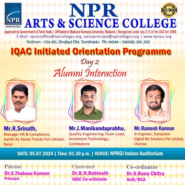 The NPR Arts and Science College organizes a Day -2 Orientation Program for freshers batch 2024-27 an Alumni Interaction for their students. Distinguished Alumni: Mr. R. Srinath, Manager HR & Compliance, Arathi A1 Home Trends Private Limited, Karur. Mr. J. Manikandaprabhu, Quality Engineering Team Lead, Accenture Technology, Coimbatore. Mr. Ramesh Kannan, Sr. Engineer, Outsystem Digital Biz…