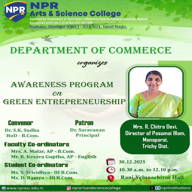 The Department of Commerce Organizes Awareness Program on Green Entrepreneurship for their students. Resource Person: Mrs. R. Chitra Devi, Director of Pasumai Illam, Manaparai, Trichy Dist.