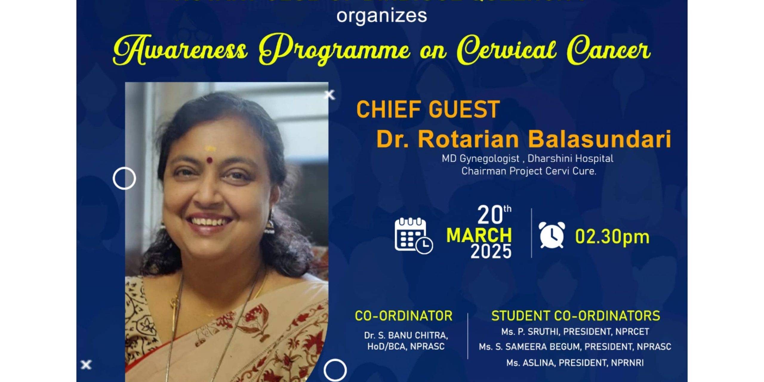 The Women’s Development Cell, in association with the Rotary Club of Dindigul Queencity, organizes an Awareness Programme on Cervical Cancer for their female students