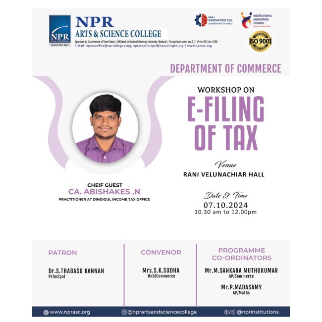 The Department of Commerce organizes a Workshop on E-Filing of Tax for their students Resource Person: CA. Abishakes N (Practitioner at Dindigul Income Tax Office)
