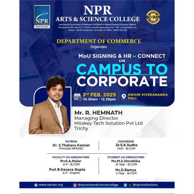 The Department of Commerce organizes an MoU Signing Ceremony and HR Connect on Campus to Corporate for their students Resource Person: Mr. R. Hemnath Managing Director, Hitakey Tech. Solution Pvt. Ltd., Trichy,