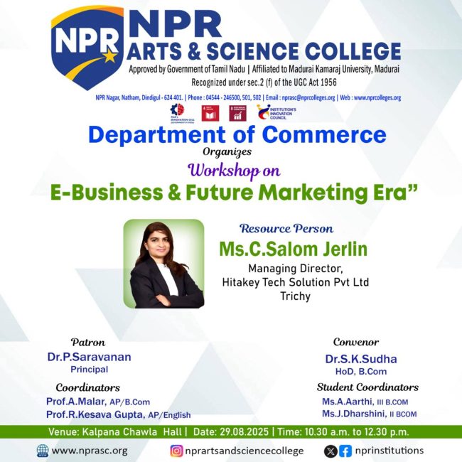 The Department of Commerce Organizes Workshop on E-Business & Future Marketing Era for their students. Resource Person: Ms. C. Salom Jerlin Managing Director Hitakey Tech Solution Pvt. Ltd., Trichy.
