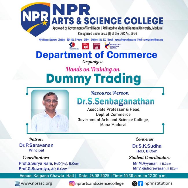 The Department of Commerce Organizes Hands on Training on Dummy Trading for their students. Resource Person: Dr. S. Senbaganathan Associate Professor & Head Dept of Commerce, Government Arts and Science College, Mana Madurai.