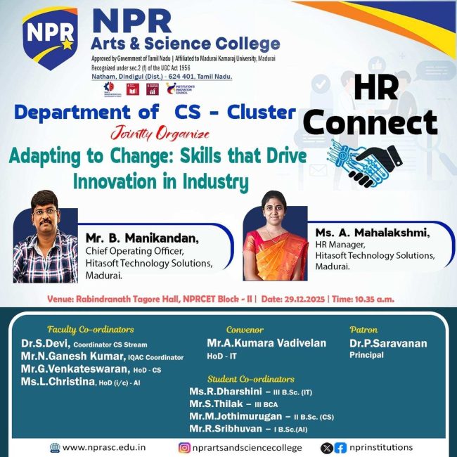 The Department of CS – Cluster Jointty organizes Adapting to Change: Skills that Drive Innovation in Industry for their students. Resource Persons: Mr. B. Manikandan, Chief Operating Officer, Hitasoft Technology Solutions, Madurai. Ms. A. Mahalakshmi, HR Manager, Hitasoft Technology Solutions, Madurai.