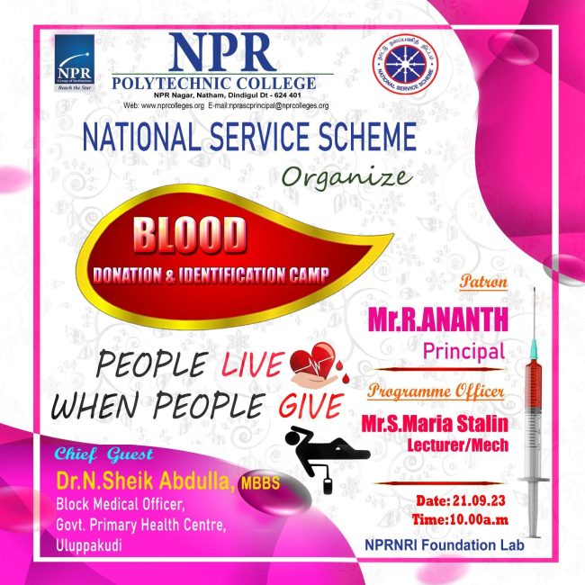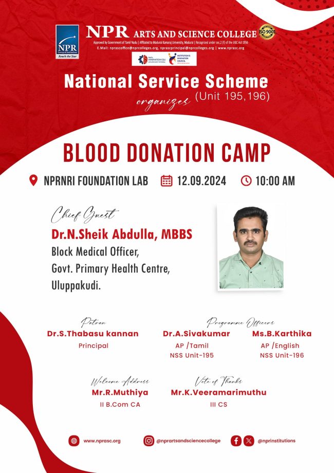 The National Service Scheme Units (195&196) organizes Medical Checkup Check, Consult & Cure for their staffs & students Medical Camp Conducted by: Dr. N. Sheik Abdulla, M.B.B.S., Block Medical Officer, Govt. Primary Health Centre, Uluppakudi.