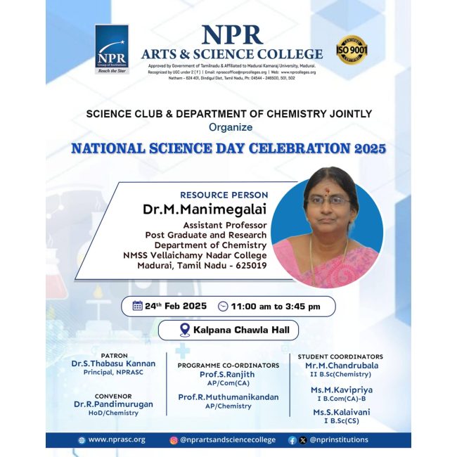 The Department of Chemistry and the Science Club jointly organizes a National Science Day Celebration 2025 Resource Person: Dr. M. Manimegalai, Assistant Professor, Post Graduate and Research, Department of Chemistry, NMSS Vellaichamy Nadar College, Madurai.