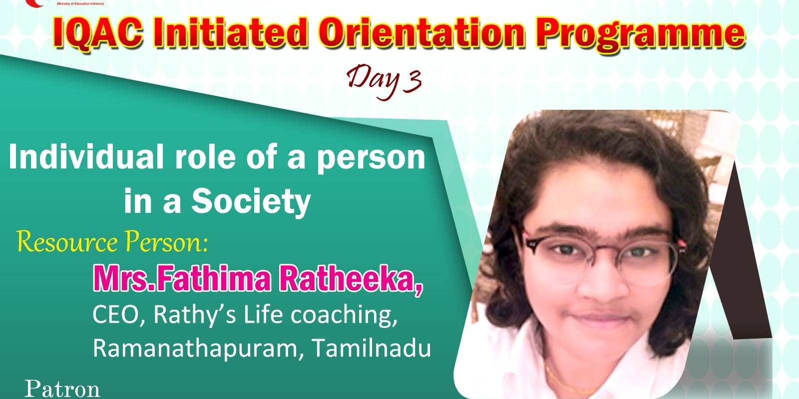The NPR Arts and Science College organizes a Day -3 Orientation Program for freshers batch 2024-27 a Guest Lecture on the Individual role of a person in a Society for their students.